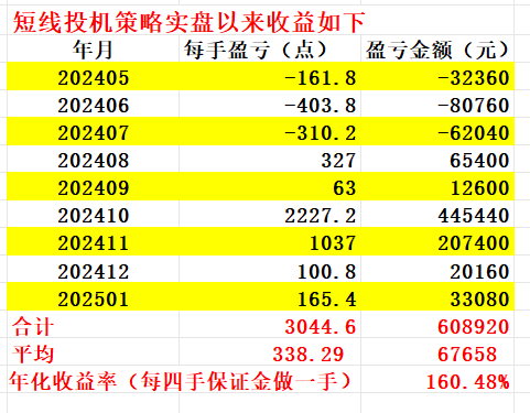 如图,截至2025年1月,短线策略实盘以来的九个月总盈利为每手60.89万元,月平均盈利为每手6.76万元,年化收益率(按每四手保证金做一手合约计算)为160.48%。九个月以来策略运行正常,月平均收益和年化收益率略低于历史平均值。