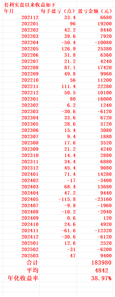 如图,收盘后以结算价计算的本轮套利交易的收益暂时为每手47个点,即每手盈利9400元,今天每手实现收益(19)*200=3800元。过去三十八个月套利总盈利为每手183980元,月平均盈利为每手4842元,年化收益率为38.97%。