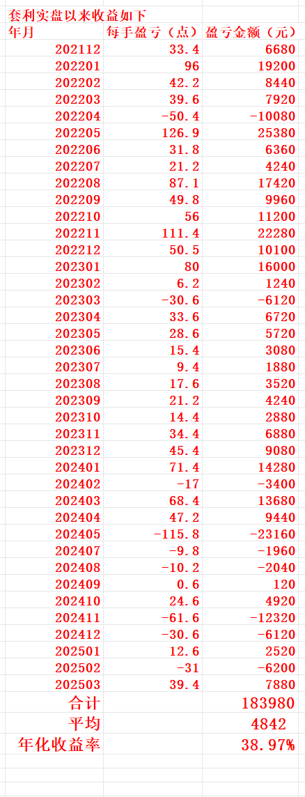 如图,收盘后以结算价计算的本轮套利交易的收益暂时为每手39.4个点,即每手盈利7880元,周五每手实现收益(-3.6)*200=-720元。过去三十八个月套利总盈利为每手183980元,月平均盈利为每手4842元,年化收益率为38.97%。