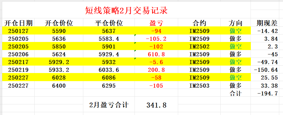 短线投机交易周五操作了一次,我早盘平掉了持有的IM2503多头头寸,仓位一手,该笔收益最终为每手-21000元。至此,2月的短线投机交易已经结束,本月短线投机交易每手一共盈利341.8个点即68360元,交易记录及操作过程如图所示。