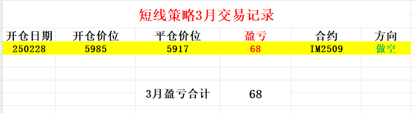 周五平掉多单后我马上新开了IM2509空头头寸,仓位还是一手,以结算价计算该笔交易周五盈利68个点即13600元。该笔交易最终的收益将计入3月份。