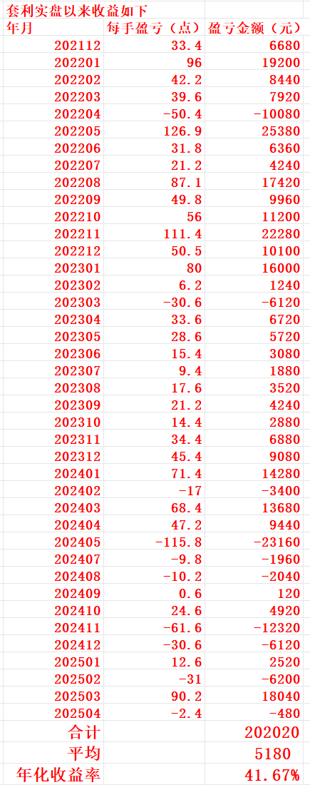如图,收盘后以结算价计算的本轮套利交易的收益暂时为每手-2.4个点,即每手亏损480元,今天每手实现收益(9)*200=1800元。过去四十个月套利总盈利为每手202020元,月平均盈利为每手5180元,年化收益率为41.67%。