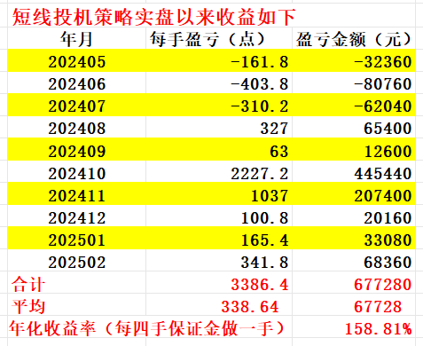如图,截至2025年2月,短线策略实盘以来的十个月总盈利为每手67.72万元,月平均盈利为每手6.77万元,年化收益率(按每四手保证金做一手合约计算)为158.81%。十个月以来策略运行正常,月平均收益和年化收益率还是略低于历史平均值。