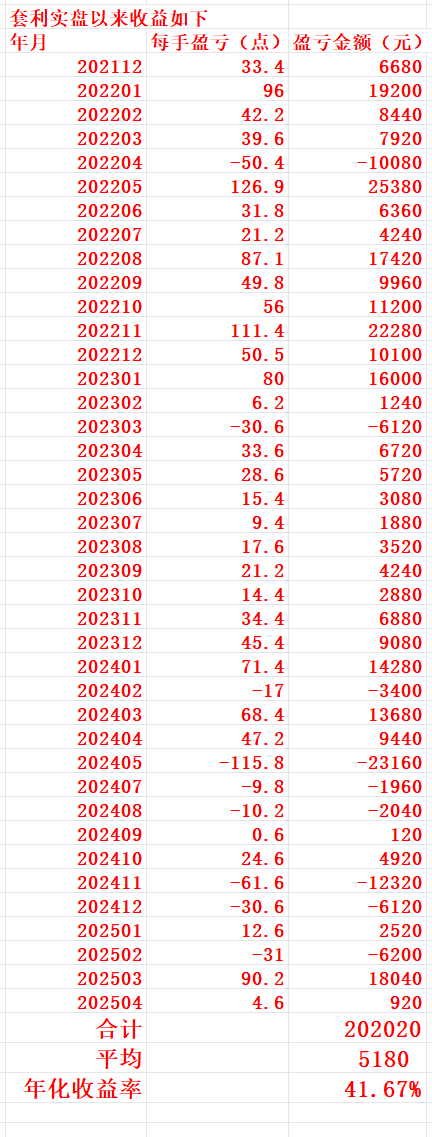 如图,收盘后以结算价计算的本轮套利交易的收益暂时为每手4.6个点,即每手盈利920元,今天每手实现收益(-29.2)*200=-5840元。过去三十九个月套利总盈利为每手202020元,月平均盈利为每手5180元,年化收益率为41.67%。