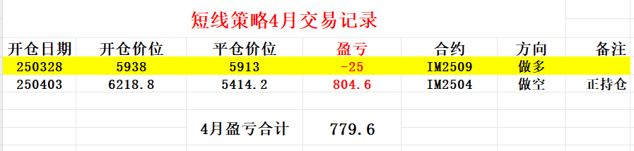 短线投机交易今天没有操作,我继续持有IM2504空头头寸,仓位一手,以结算价计算该笔交易今天每手单日盈利139.8个点即27960元,到今天为止该笔交易每手共盈利804.6个点即160920元。