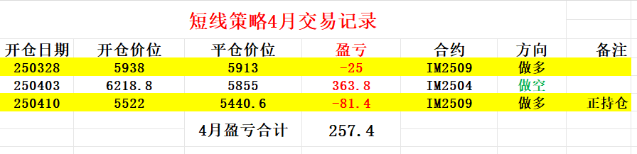 短线投机交易今天操作了一次,我早上平掉了持有的IM2504空头头寸,仓位一手,该笔收益最终为每手363.8个点即72760元;同时新开IM2509多头头寸,仓位一手,以结算价计算该笔交易今天每手亏损81.4个点即16280元。