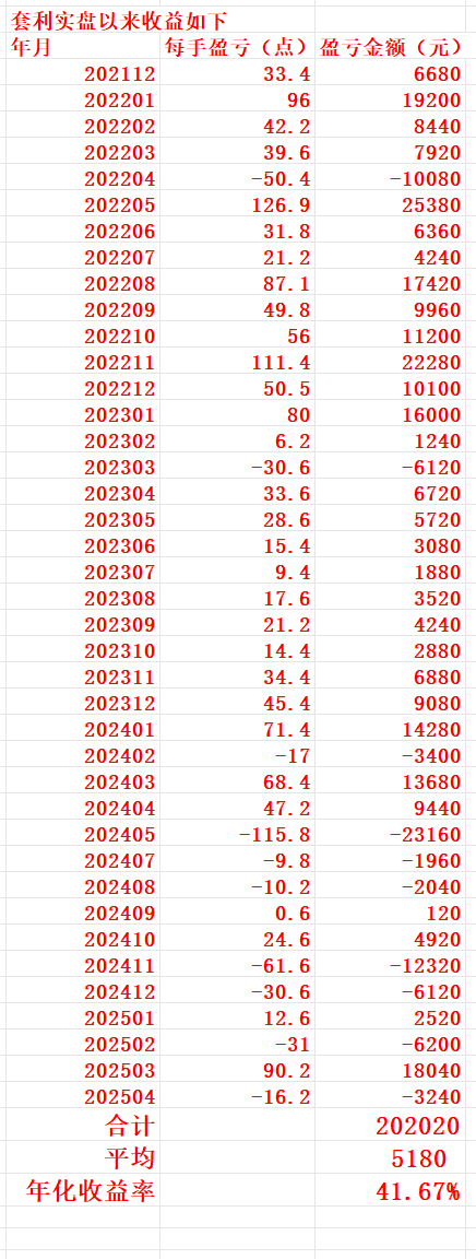 如图,收盘后以结算价计算的本轮套利交易的收益暂时为每手-16.2个点,即每手亏损3240元,今天每手实现收益(-10.2)*200=-2040元。过去三十九个月套利总盈利为每手202020元,月平均盈利为每手5180元,年化收益率为41.67%。