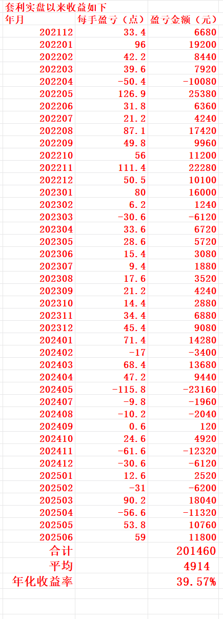 过去四十一个月套利总盈利为每手201460元,月平均盈利为每手4914元,年化收益率为39.57%。