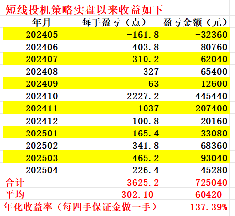 如图,截至2025年4月,短线策略实盘以来的十二个月总盈利为每手72.5万元,月平均盈利为每手6万元,年化收益率(按每四手保证金做一手合约计算)为137.39%。