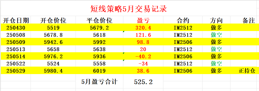 短线投机交易今天操作了一次,我早上平掉了持有的IM2512空头头寸,仓位一手,该笔收益最终为每手-34个点即-6800元;同时新开IM2506多头头寸,仓位一手,以结算价计算该笔交易今天盈利38.6个点即7720元。