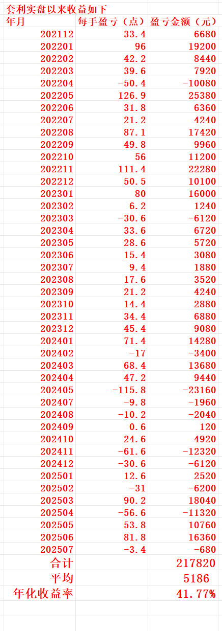 过去四十二个月套利总盈利为每手217820元,月平均盈利为每手5186元,年化收益率为41.77%。