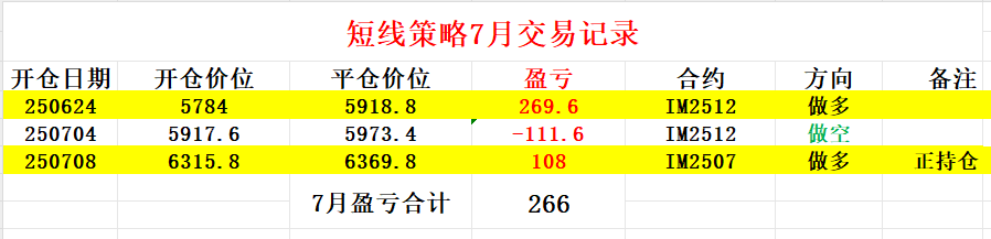 短线策略方面,今天我操作了一次,早盘开盘后没多久即平空反手开了多单,现在持有IM2507多单,还是两倍仓位。