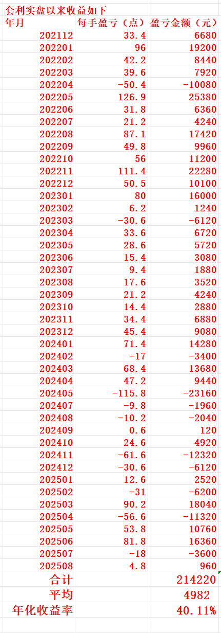 过去四十三个月套利总盈利为每手214220元,月平均盈利为每手4982元,年化收益率为40.11%。