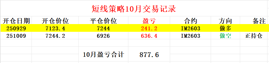 短线投机策略今天没有操作,我继续持有IM2603空头头寸,仓位两手。以结算价计算该笔交易今天实际每手盈利150.6个点,两手共盈利301.2个点即共60240元,到今天为止该笔交易暂时盈利636.4个点即127280元。