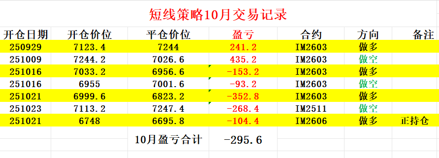 短线投机策略今天操作了两次,我早盘开盘后先是平掉了持有的IM2603多头头寸,仓位两手,该笔收益最终为-352.8个点即-70560元;同时新开IM2511空头头寸,仓位两手,但该笔交易尾盘就又被迫平掉了,该笔交易收益最终为-268.4个点即-53680元。