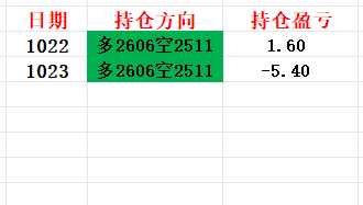 套利交易方面,我继续持有做多IM2606、做空IM2511的组合头寸。所持头寸按结算价计算现在每手暂时亏损5.4个点,其中今天每手亏损7个点即1400元。