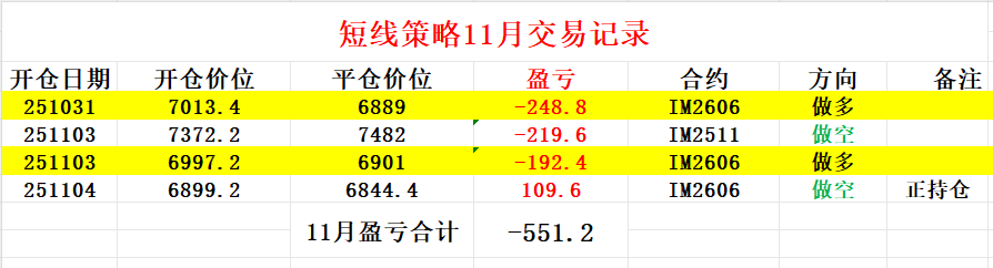 截至今天11月短线投机交易暂时亏损551.2个点即110240元,交易记录及操作过程如图所示。