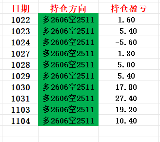 套利交易方面,我继续持有做多IM2606、做空IM2511的组合头寸。所持头寸按结算价计算现在每手暂时盈利10.4个点,其中今天每手亏损8.8个点即1760元。