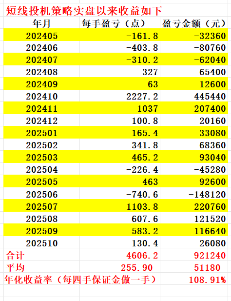 如图,截至2025年10月,短线策略实盘以来的十八个月总盈利为每手92万元,月平均盈利为每手5.1万元,年化收益率(按每四手保证金做一手合约计算)为108.91%。十八个月以来策略运行正常,但月平均收益和年化收益率暂时还是明显低于7万和150%的历史平均值。