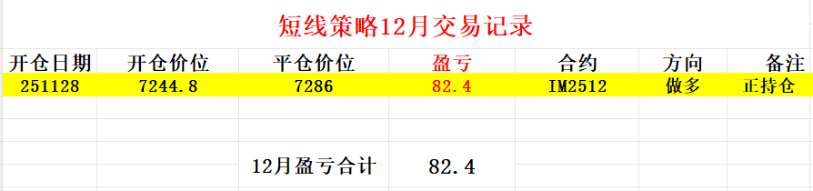 短线投机交易今天没有操作,但我根据套利策略的信号更换了持仓合约,持仓合约由IM2606更换为了IM2512,仓位依然为两手。经调整计算后,以结算价计算该笔交易今天实际每手盈利31.2个点,两手一共盈利62.4个点即12480元,到今天为止该笔交易暂时共盈利82.4个点即16480元。