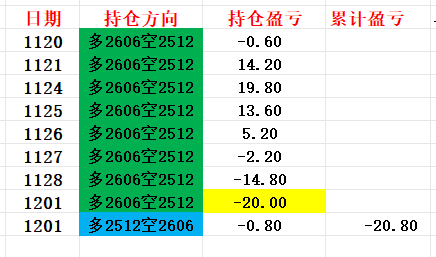 套利交易方面,今天我更换了合约组合方向,平仓头寸组合做多IM2606、做空IM2512的最终收益为每手-20个点。新建头寸组合为做多IM2512、做空IM2606,新建回的头寸以结算价计算今天每手亏损0.8个点。