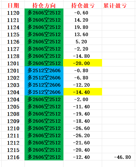 截至今天本轮套利每手暂时一共亏损46.8个点即9360元。