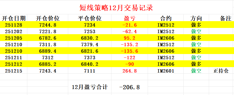 短线投机策略今天没有操作,我继续持有IM2601空头头寸,仓位两手。以结算价计算该笔交易今天实际每手盈利129个点,两手一共盈利258个点即51600元,到今天为止该笔交易暂时一共盈利264.8个点即52960元。