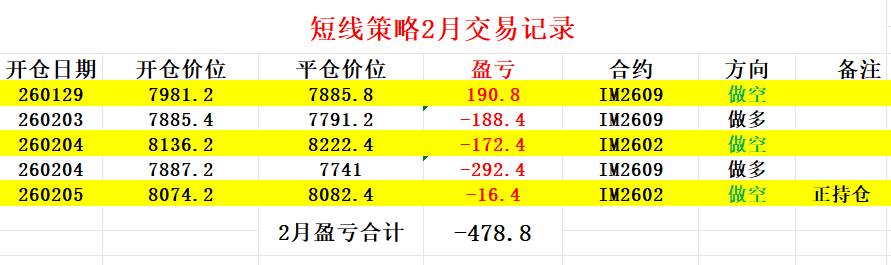 短线投机策略周五没有操作,我继续持有IM2602空头头寸,仓位两手。以结算价计算该笔交易周五每手盈利2.6个点,两手一共盈利5.2个点即1040元,到周五为止该笔交易暂时亏损16.4个点即3280元。