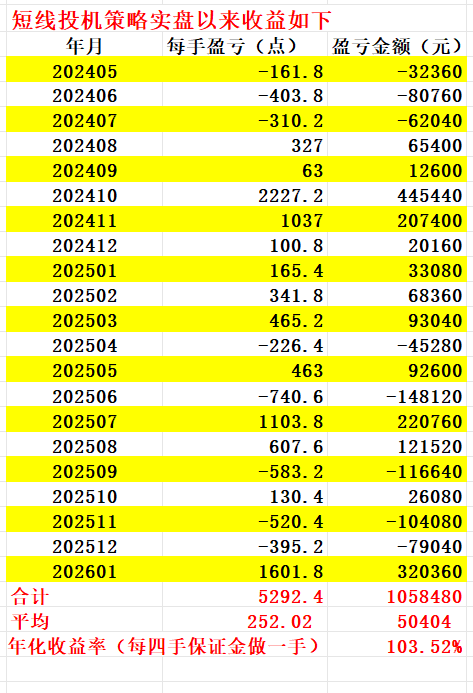 如图,截至2026年1月,短线策略实盘以来的二十一个月总盈利为每手105.8万元,月平均盈利为每手5万元,年化收益率(按每四手保证金做一手合约计算)为103.52%。二十一个月以来策略运行正常,但月平均收益和年化收益率暂时还是低于7万和150%的期望平均值。