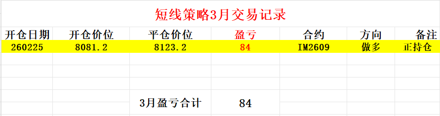如图,截至2026年2月,短线策略实盘以来的二十二个月总盈利为每手85.48万元,月平均盈利为每手3.88万元,年化收益率(按每四手保证金做一手合约计算)为78.49%。二十二个月以来策略运行正常,但月平均收益和年化收益率暂时还是大幅低于7万和150%的期望平均值。