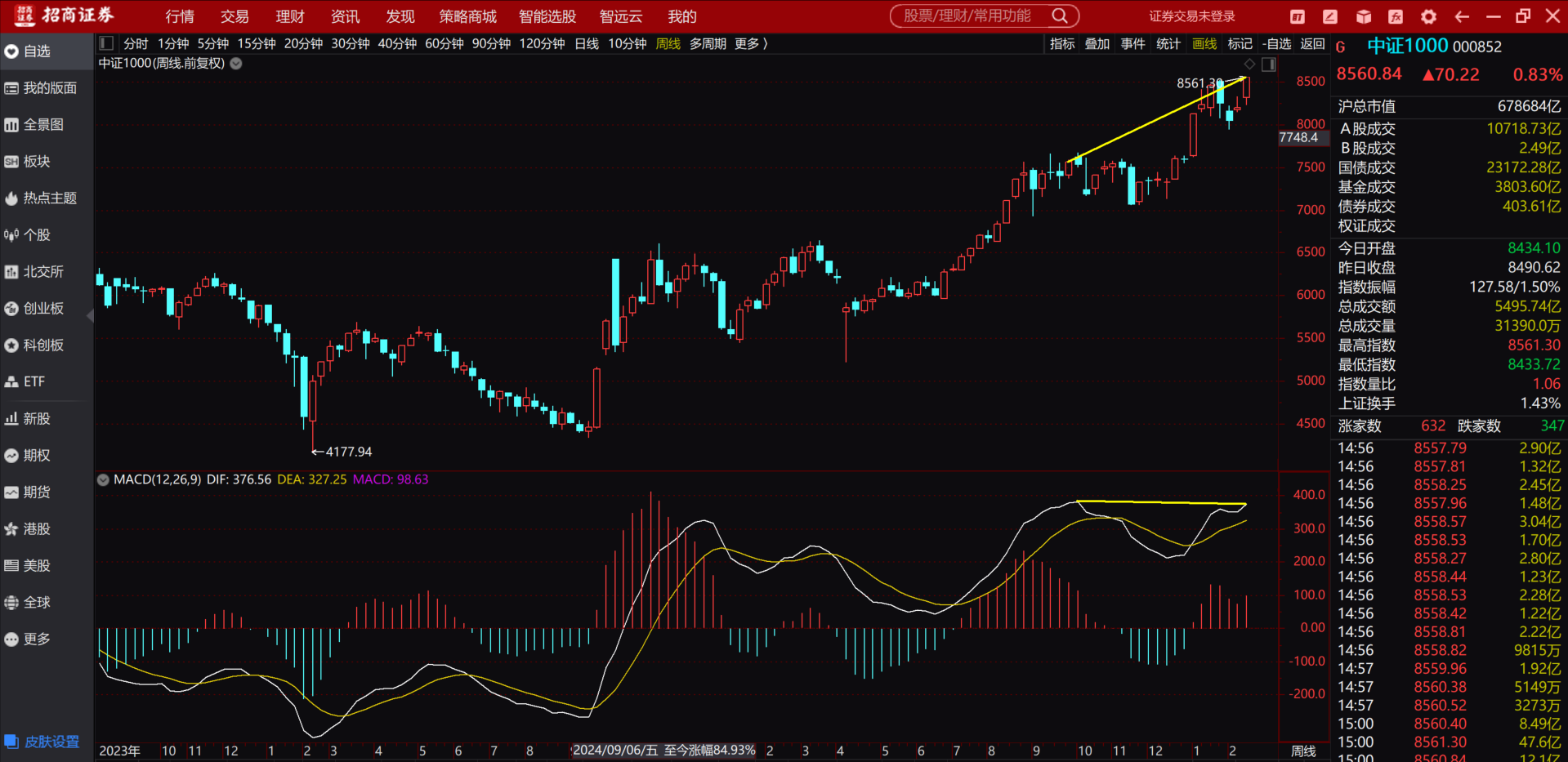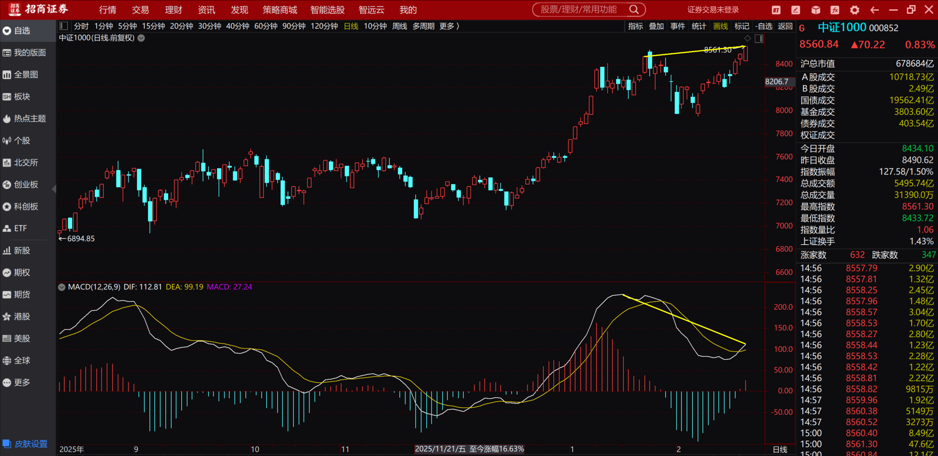 中证1000周五继续走高这样日线的顶背离也已经出现了,如图。