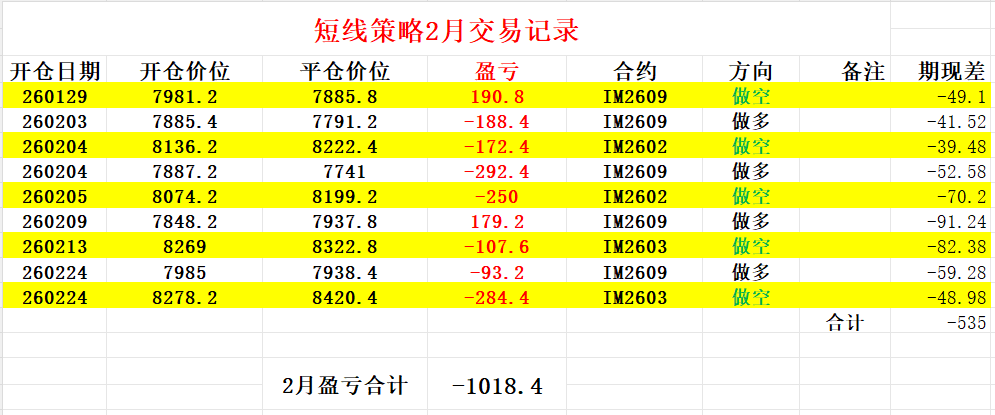 短线策略2月收益非常糟糕,无论是期货交易的收益还是策略按现货计算的原始收益都极差。2月全月基本不是窄幅震荡行情就是宽幅震荡行情,操作很频繁。过程中有两波极小的单边行情,但这两笔盈利相对频繁的止损来说就是杯水车薪。又由于操作很频繁还出现了极大的不利期现差,亏损里大半其实都是期现差。