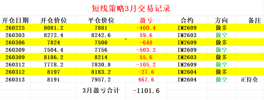 套利交易方面,按规则今天我平掉了持有的做多IM2603、做空IM2609的组合头寸,所持头寸最终每手盈利24.4个点即4880。本轮套利到今天结束,交易过程如图所示。
