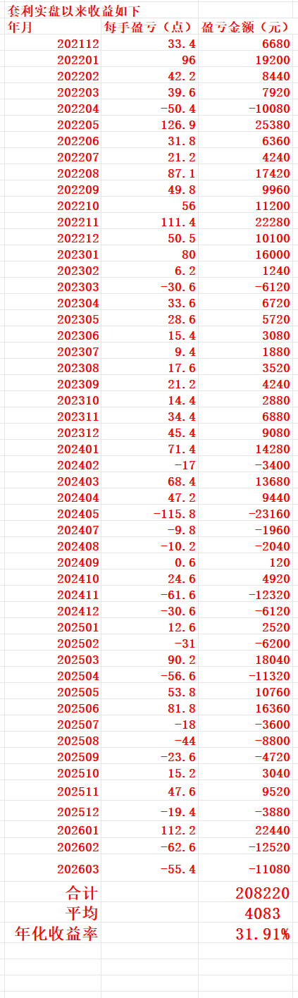 过去五十一个月套利总盈利为每手208220元,月平均盈利为每手4083元,年化收益率为31.91%。