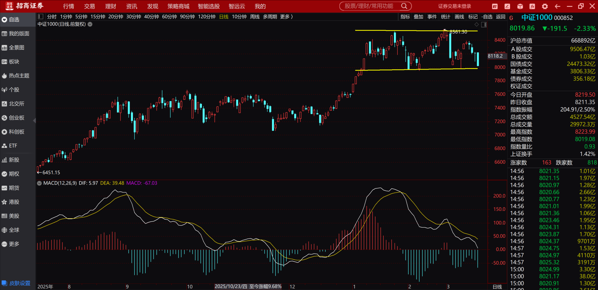 短线策略今天没有操作,中证1000大跌对短线策略有利,现在短线行情又走出了很明显的下跌趋势了。