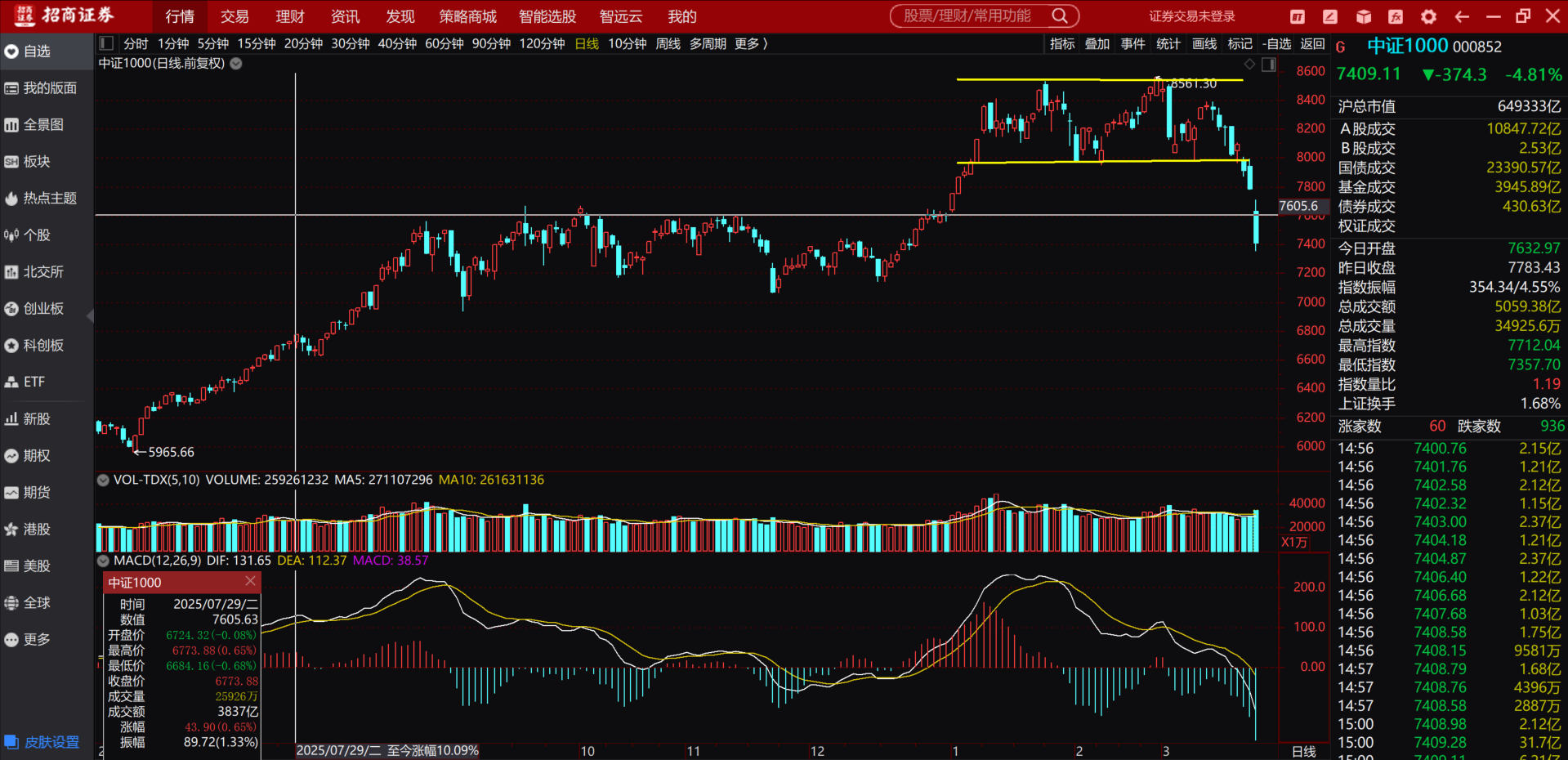中证1000今天已经直接跌破7600的可能的支撑位,下一个可能有较强的支撑的点位在7150附近。但是就行情分析来说,即使回到7150也不意味着可以转回看多做多,往下降速出现合适的低点信号,以及往上重新突破中长线趋势才是可以再次尝试做多的标准信号。