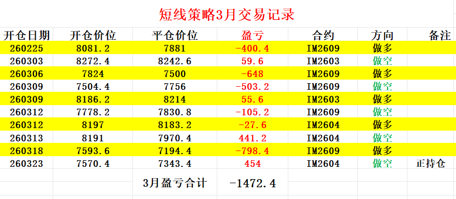 截至今天,3月短线投机交易暂时亏损1472.4个点即294480元,交易记录及操作过程如图所示。