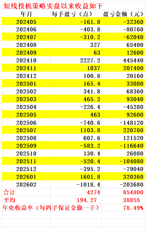 如图,截至2026年2月,短线策略实盘以来的二十二个月总盈利为每手85.48万元,月平均盈利为每手3.88万元,年化收益率(按每四手保证金做一手合约计算)为78.49%。二十二个月以来策略运行正常,但月平均收益和年化收益率暂时还是大幅低于7万和150%的期望平均值。
