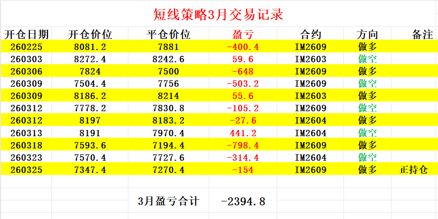 短线投机策略今天操作了一次,我早盘平掉了持有的IM2604空头头寸,仓位两手,该笔收益最终为-314.4个点即-62880元;同时新开IM2609多头头寸,仓位还是两手,以结算价计算该笔交易今天每手亏损77个点,两手一共亏损154个点即30800元。