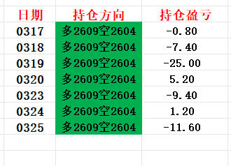 套利交易方面,我继续持有做多IM2609、做空IM2604的组合头寸。所持头寸按结算价计算现在每手亏损11.6个点,其中今天每手亏损12.8个点即2560元。