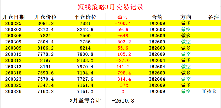 短线策略今天下午在中证1000走弱时操作了一次,现在持有IM2609空单,还是两倍仓位。