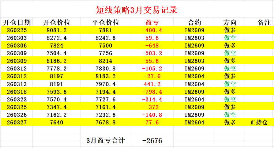 截至周五,3月短线投机交易暂时亏损2676个点即535200元,交易记录及操作过程如图所示。
