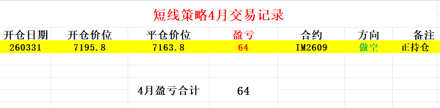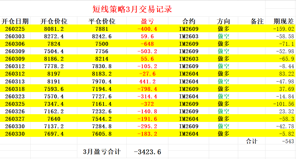 短线投机策略今天操作了一次,我早上平掉了持有的IM2604多头头寸,仓位两手,该笔收益最终为-183.2个点即-36640元。至此3月短线策略交易结束,3月短线投机交易亏损3423.6个点即684720元,交易记录及操作过程如图所示。