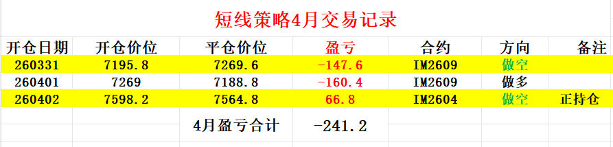 短线策略今天没有操作,现在继续持有空单,只是今天根据套利策略将持仓合约由IM2609换成了IM2604。短线行情现在还在下跌趋势,所以暂时也是要继续看空。