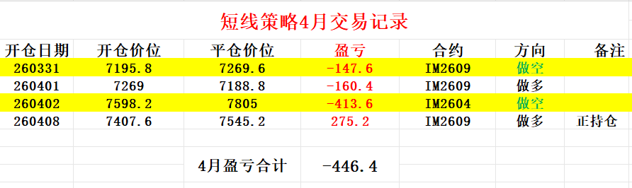 短线投机策略今天操作了一次,我早上平掉了持有的IM2604空头头寸,仓位两手,该笔收益最终为-413.6个点即-82720元;同时新开IM2609多头头寸,仓位还是两手,以结算价计算该笔交易今天每手盈利137.6个点,两手一共盈利275.2个点即55040元。