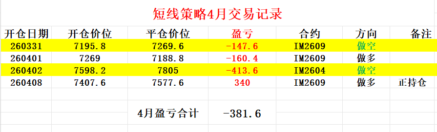 截至今天,4月短线投机交易暂时亏损381.6个点即76320元,交易记录及操作过程如图所示。