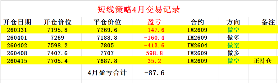 截至今天,4月短线投机交易暂时亏损87.6个点即17520元,交易记录及操作过程如图所示。