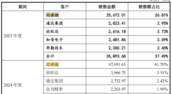 首当其冲的,是IPO关键冲刺期主动砍掉核心大客户近半数订单:公司对第一大客户比亚迪的销售收入从2024年的4.70亿元降至2025年的2.57亿元、同比降幅45.49%。