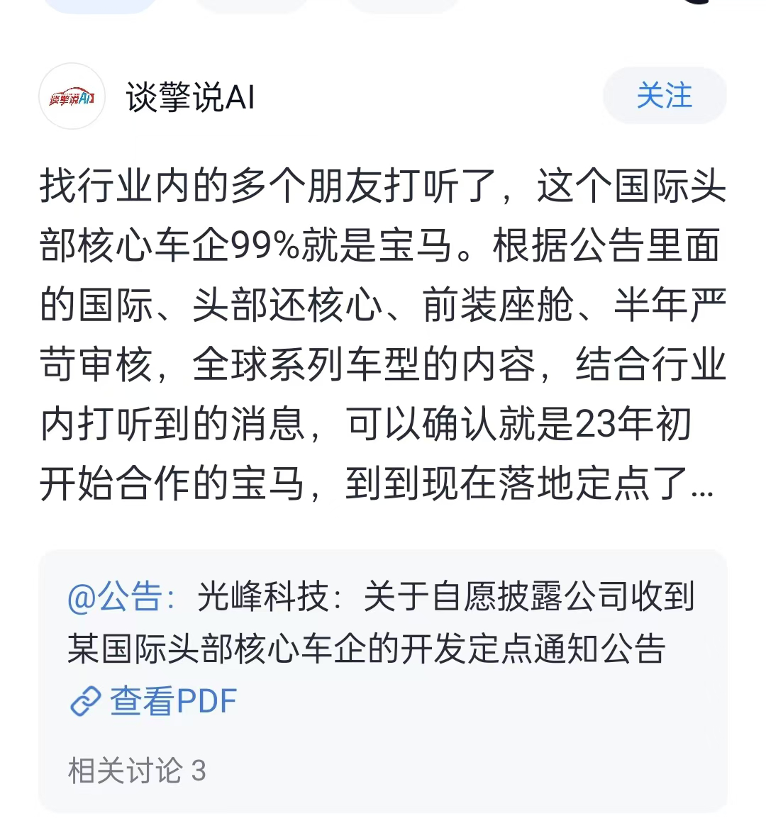 据汽车自媒体“谈擎说AI”的爆料,该定点车企指向宝马:“找行业内的多个朋友打听了,这个国际头部核心车企99%就是宝马。根据公告里面的国际、头部还核心、前装座舱、半年严苛审核,全球系列车型的内容,结合行业内打听到的消息,可以确认就是23年初开始合作的宝马,到到现在落地定点了。”