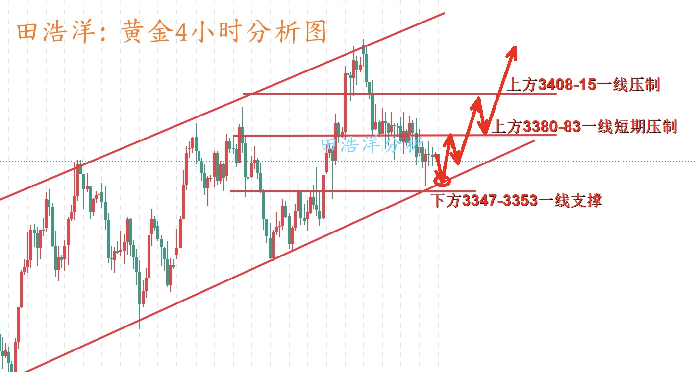 从4小时分析来看,下方支撑关注3347-53附近,上方短期阻力关注3380-83一线关口,重点关注3408-3415一线压制,继续依托此区间保持高空低多循环参与主基调不变,中间位置一律多看少动谨慎追单,耐心等待关键点位进场。具体操作策略我会在盘中提示,及时关注。